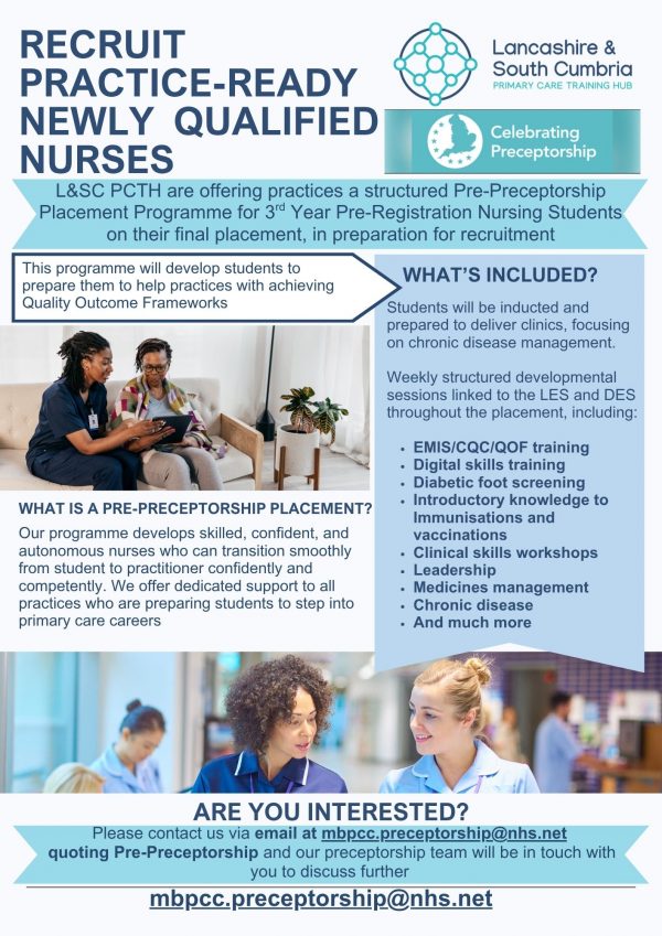 Lancashire and South Cumbria Primary Care Training Hub are offering practices a structured Pre-Preceptorship Placement Programme for 3rd Year Pre Reg Nursing Students on their final placement in Primary Care.