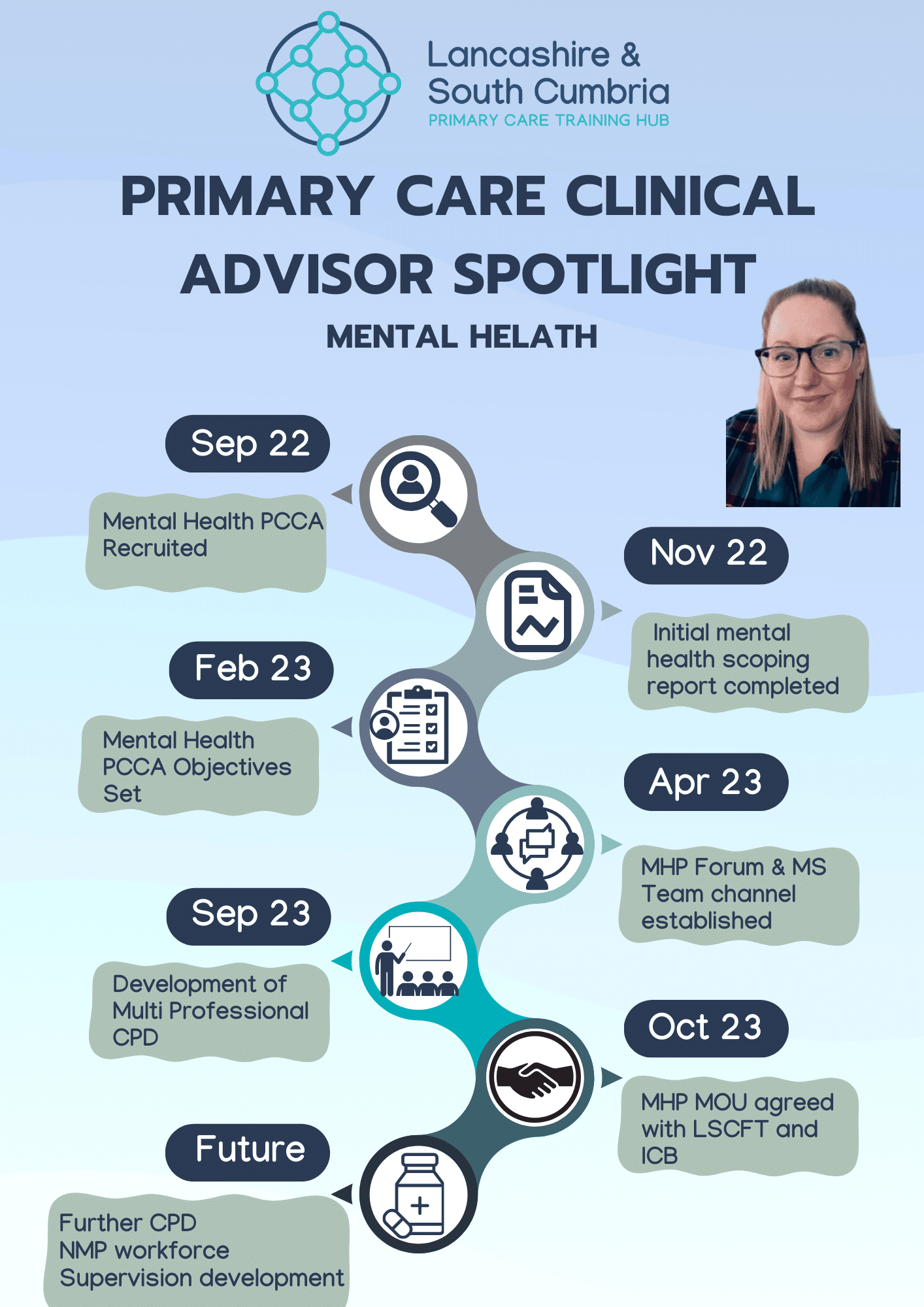 The second model is based on ongoing support, where the mental health practitioner can offer support and interventions from the start of a mental health ‘episode’ and follow the patient through over a period of time until the immediate issue is resolved. This model appears to be more commonly used across Lancashire and South Cumbria with some GP’s appointing mental health practitioners independently and others utilising the PCN ARRS roles. There are no size fits all approach to this role as the population needs will differ dependent on geographical location, so it is very important to think about what support your population requires.